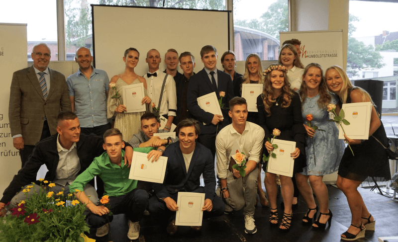 Im Rahmen der Abschlussfeier der Abteilung Gesundheit des Berufskollegs Humboldtstraße am 30.06.2017 haben 15 Absolventinnen und Absolventen des Beruflichen Gymnasiums Gesundheit und Soziales neben dem Abiturzeugnis vom Vorsitzenden des Stadtsportbundes Klaus Hoffmann ihre Übungsleiter-C-Lizenz überreicht bekommen. Nachdem die ehemaligen Schülerinnen und Schüler sich mit dem Besuch des Bildungsganges für die Anleitung von Sportangeboten qualifiziert und ihre staatliche Prüfung zur / zum Freizeitsportleiter/in bestanden haben, können sie sich mit der C-Lizenz in Sportvereinen engagieren.